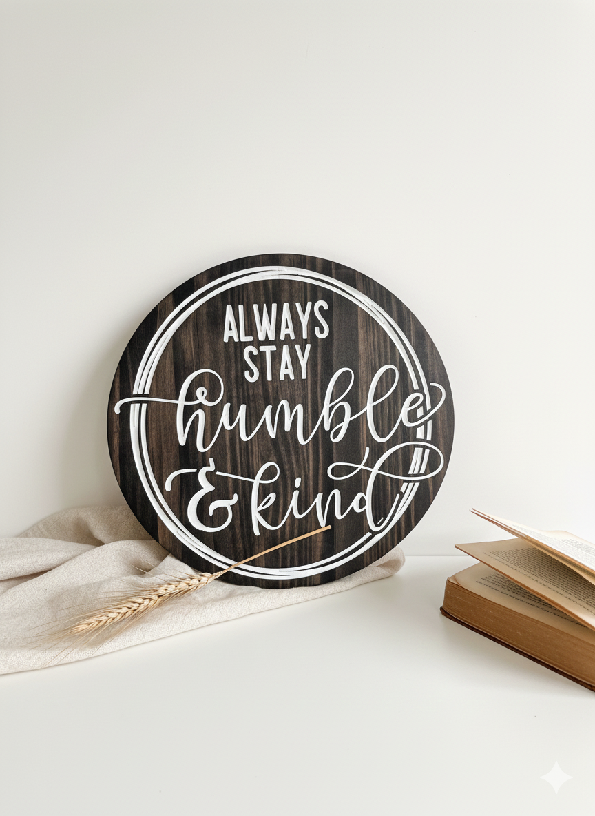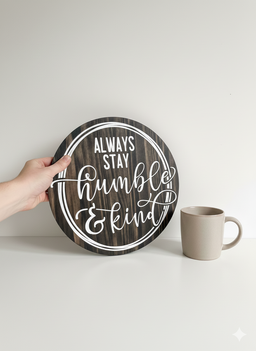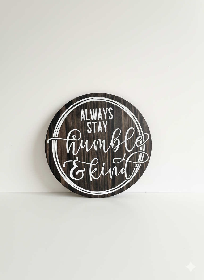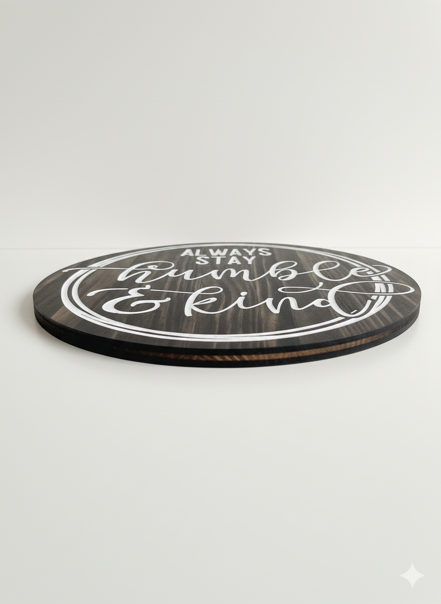 Add a touch of heartfelt charm to your home with this 16" round wooden wall sign featuring the inspiring message, "Always Stay Humble & Kind." Handcrafted with care, this decorative piece boasts a rich dark walnut stain and sleek white lettering, creating the perfect blend of rustic and modern farmhouse appeal. Whether you're decorating your living room, entryway, or office, this sign serves as a timeless reminder of kindness and gratitude.